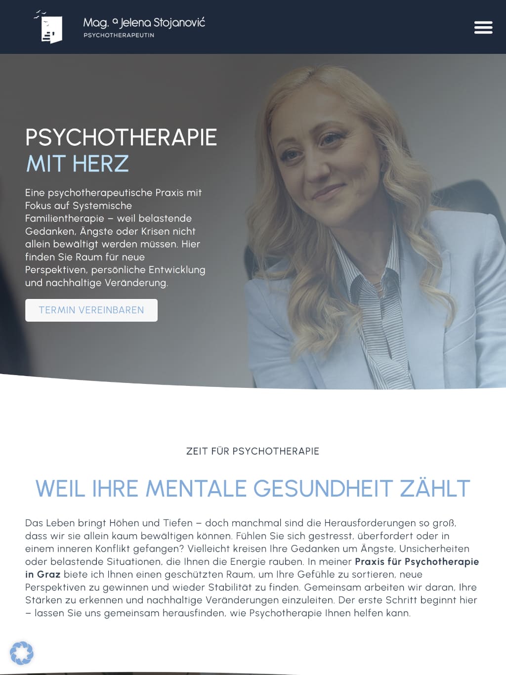 Mag. Jelena Stojanović benötigte eine professionelle Online-Präsenz für ihre psychotherapeutische Praxis in Graz mit Fokus auf Systemische Familientherapie. Die Hauptherausforderungen umfassten: